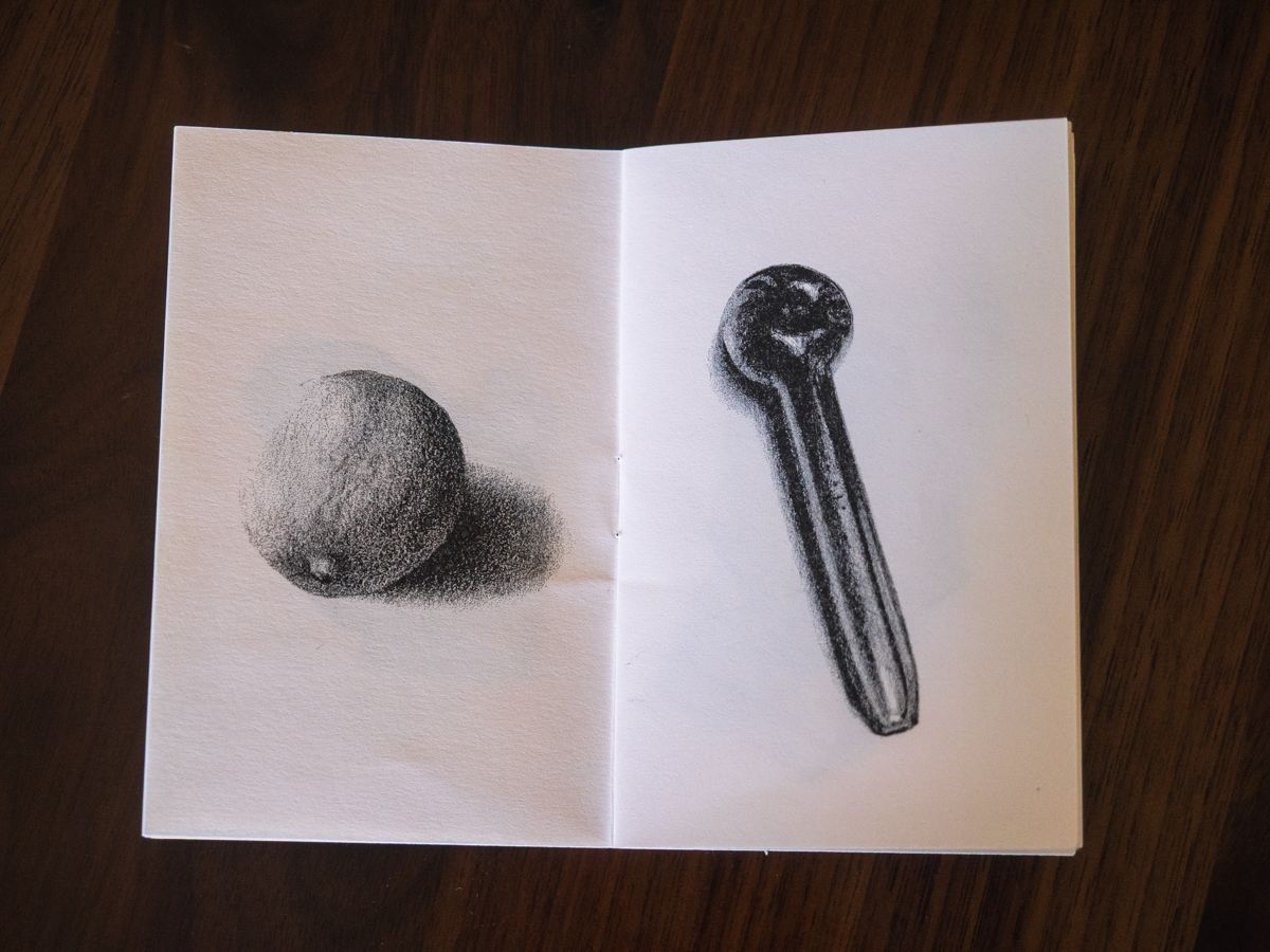 Actual Size is 4” x 2.5” and composed entirely of pencil drawings at 1:1 scale of small objects, like a pencil sharpener, a banana slug, an inkpot, a Pink Pearl eraser, and a push pin.