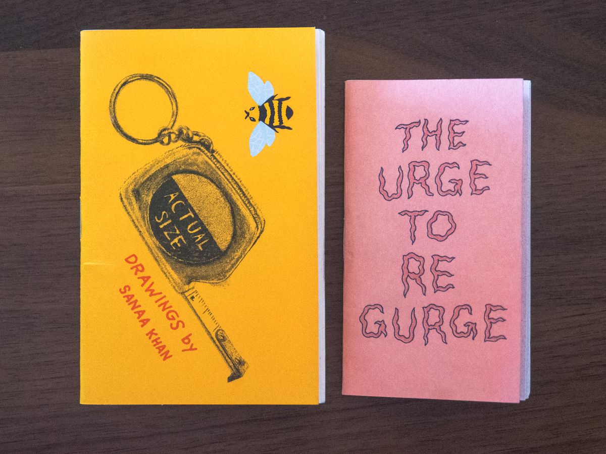 Here’s something books can do: distill an idea, bottle it up, and hand it to you in a neat, potent package, behind an enticing label. Today let’s consider two books, Sanaa Khan’s Actual Size and The Urge to Regurge. They’re each like those nips of Fireball they sell down at the liquor store: tiny, spicy, full of spirit, and best gulped down all at once. And one of them might also make you feel a bit ill afterward.