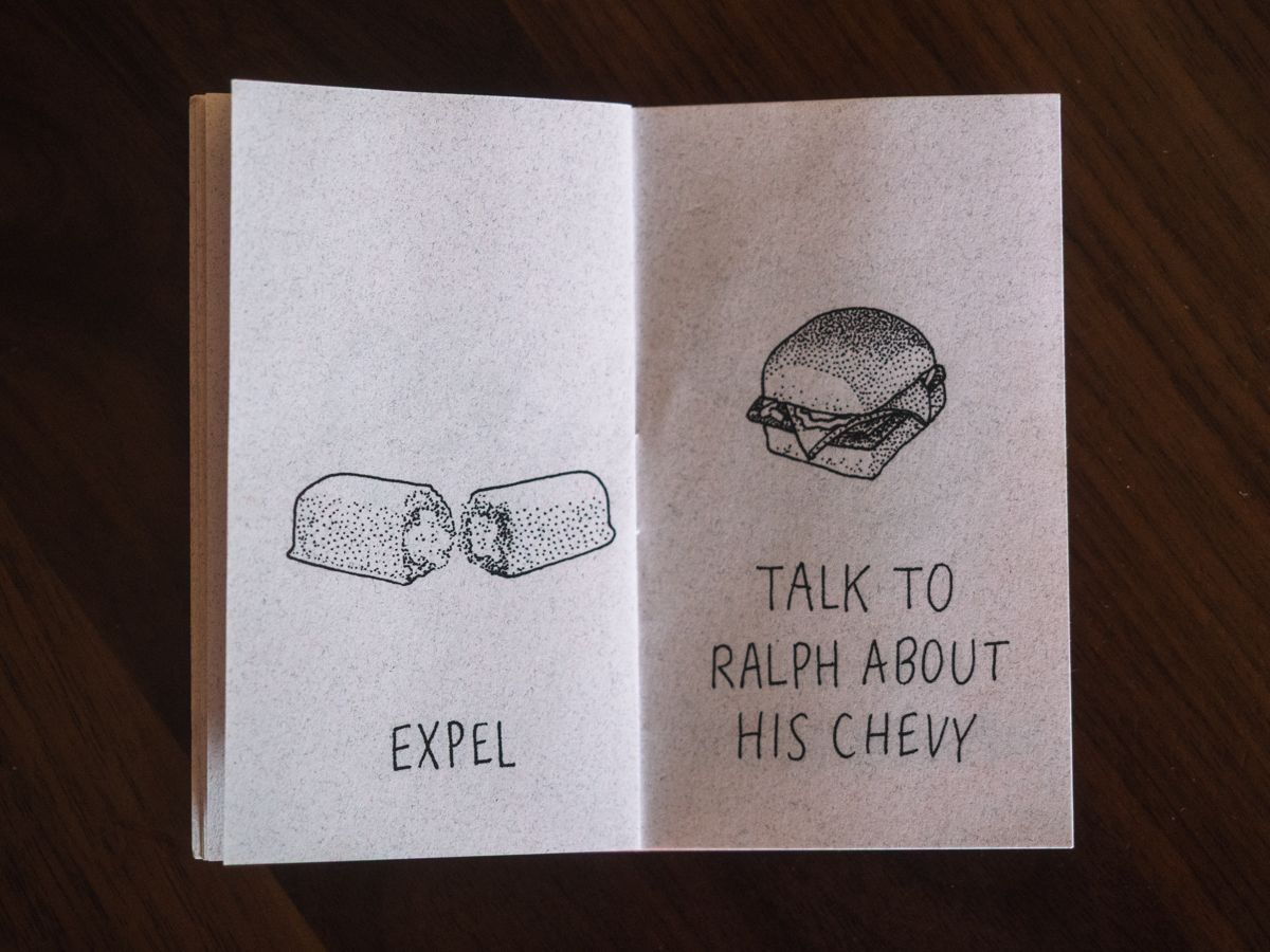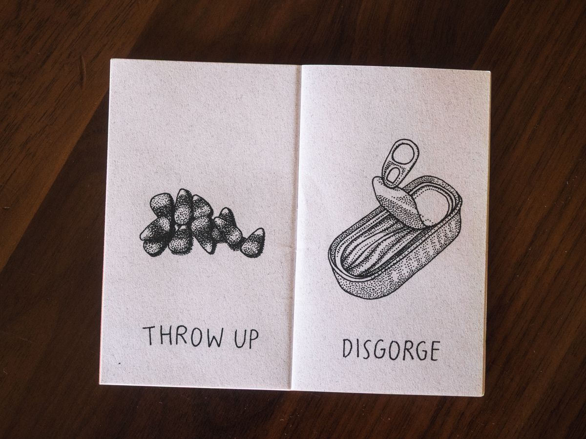 The Urge to Regurge is even smaller—3.5” x 2”—and composed entirely of stipple-shaded pen drawings of hard-to-digest foods, each accompanied by a euphemism for vomiting. Beneath the mozzarella sticks is the word BARF; beneath the Slurpee, VOM; beneath the shrimp cocktail, SPEW.