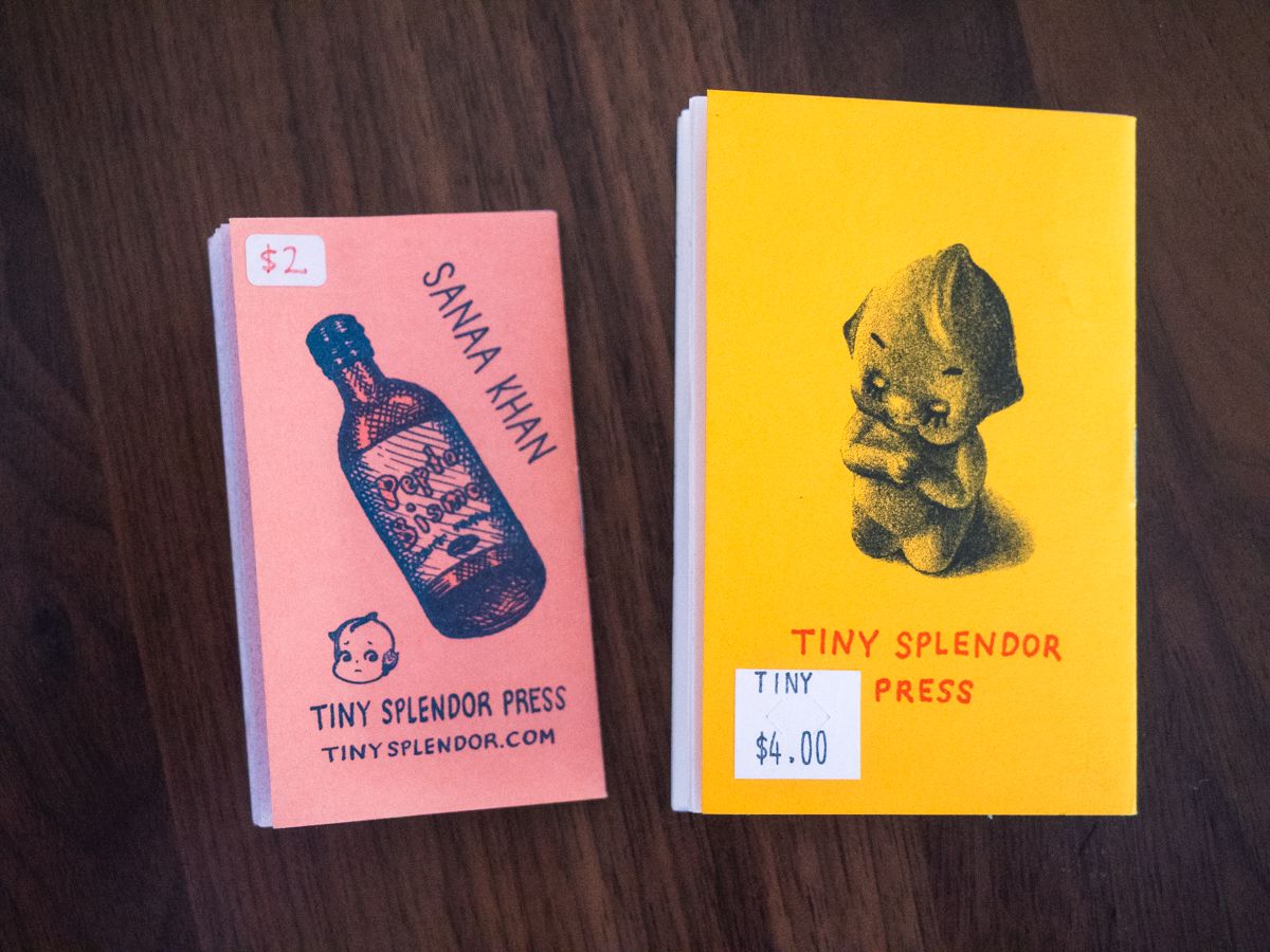 Writing this essay, for the first time I visited the website for the publisher, Tiny Splendor Press. How sweet to learn some context about the milieu from which they emerge. It turns out the press is a collaboration between Max Stadnik and Sanaa Khan (out of Berkeley) and Cynthia T Navarro (out of Los Angeles). They have a big catalog, which mostly seems to be sold out of their online store, but which includes a bunch of other intriguing zines by Khan. (For instance: Gags. World of Warts. A-Z of Uncommon Phobias. Sunday Smiles. The Old Grudge. The Many Ways of the Potato.) They also hire out as a printer, and they run workshops in both Berkeley and LA. I sent them an email asking to get on their mailing list, and hopefully someday soon I can take one of their riso-printing workshops here in LA. I’ll report back if I do.