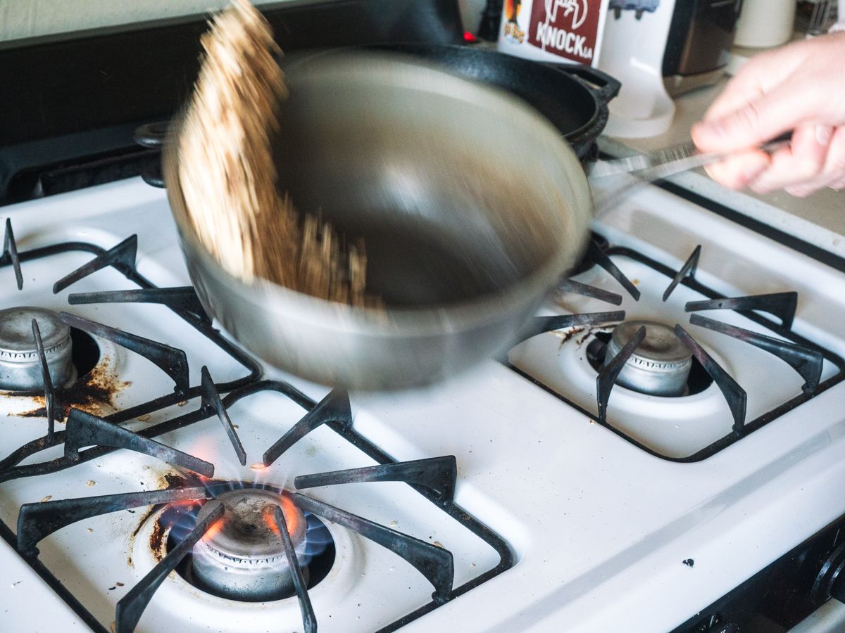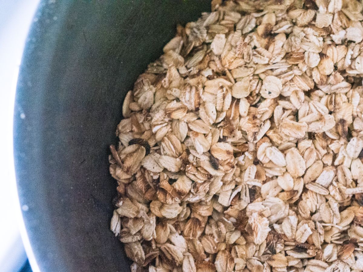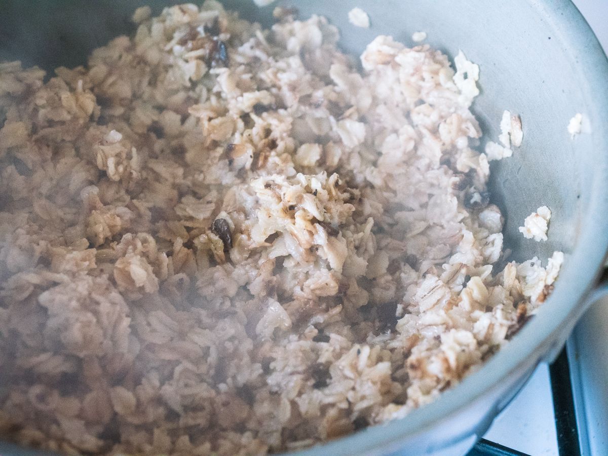 The day I learn the recipe: 2010, springtime, a bright Saturday morning. There I was, a college sophomore standing in the mostly-clean commercial kitchen of the co-op I had recently moved into. I had a big block of cheddar cheese and was getting ready to fix myself some eggs for breakfast when I smelled something burning and looked up. The only other person in the kitchen was my housemate Tim. He stood in front of the gas range, stirring a pot with a wooden spoon, the burner on high. Inside the pot, I noticed, were rolled oats—but no water. And it wasn’t quite a burning smell. It was more bewitching, somewhere between sweet caramel and woodsmoke, like bread when it’s almost done baking.
