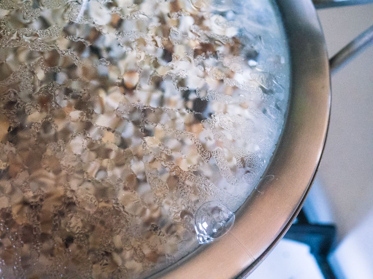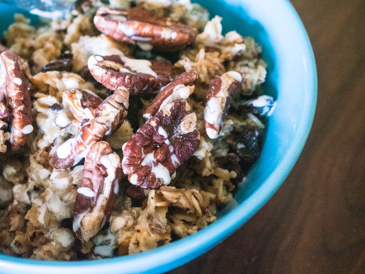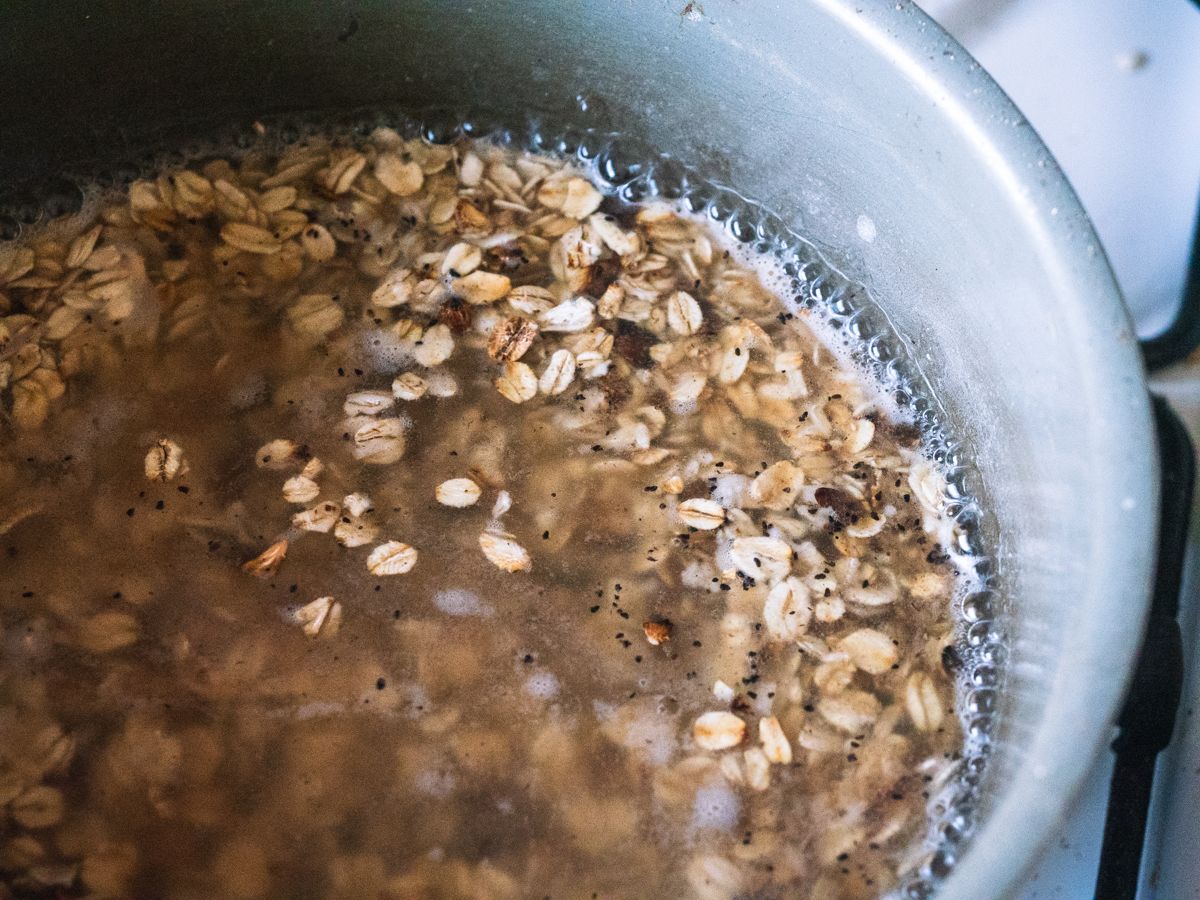 Bring to a boil. (Pay attention that the pot doesn’t boil over.) Once it boils, reduce to a low simmer and cover completely. Stir occasionally. At this point you may want to start toasting some pecans or other nuts to top the oatmeal with.