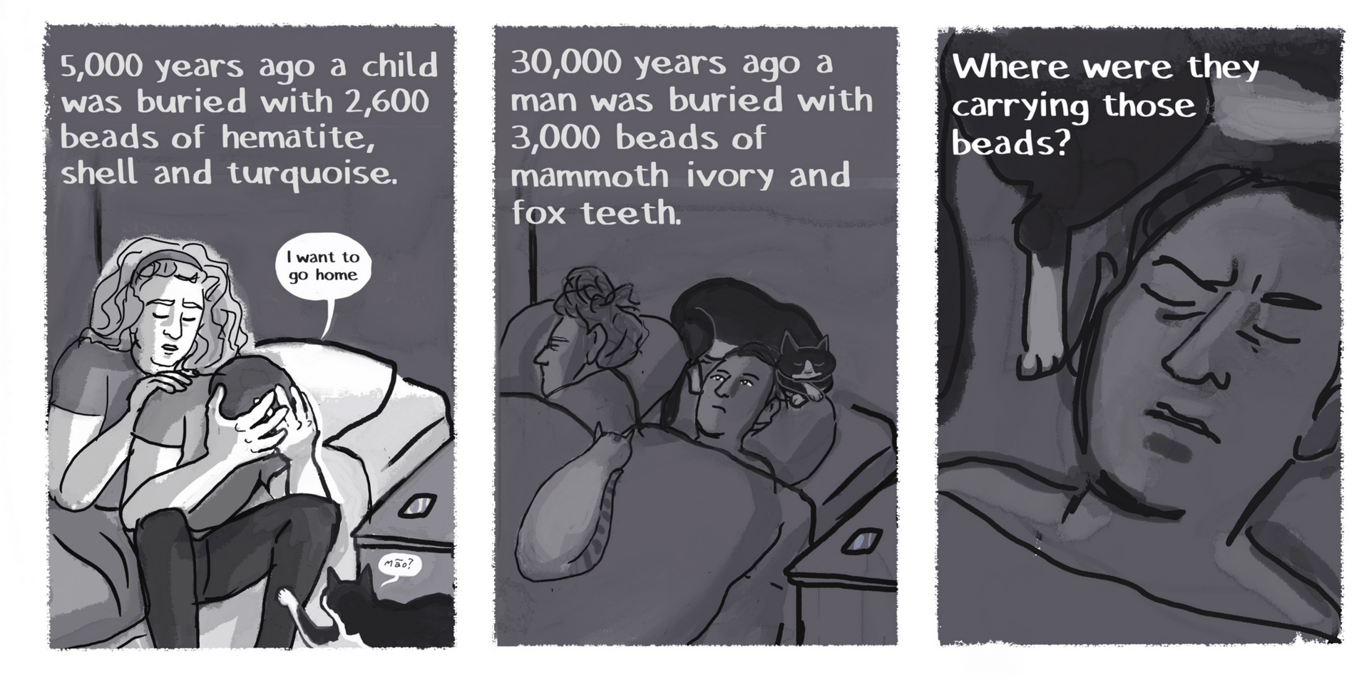 S.I. Rosenbaum has a comic out in Flaming Hydra—“Lost and found”—that captures something of how this moment feels to me, too. I mean, I haven’t expatriated to Lisbon, I’m not married to a trans person, I don’t find myself compulsively looking for beads—and yet, I know that feeling of life passing, atrocities ongoing, and the mind trying to find meaning, trying to find mooring. It’s a beautiful piece.