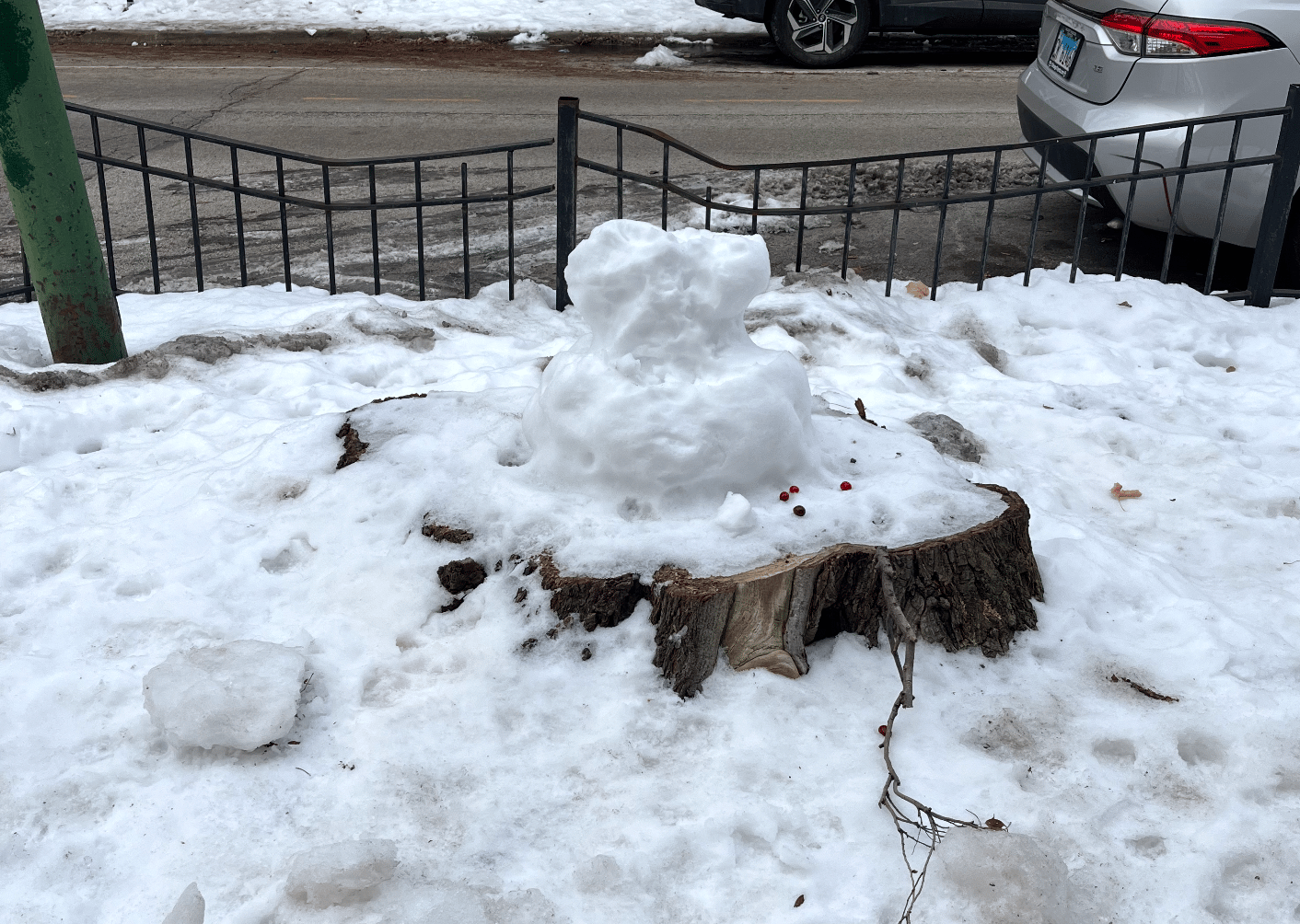 Final melt report: the snowman was knocked over by a miscreant. Whether human or beast we shall never know. RIP.