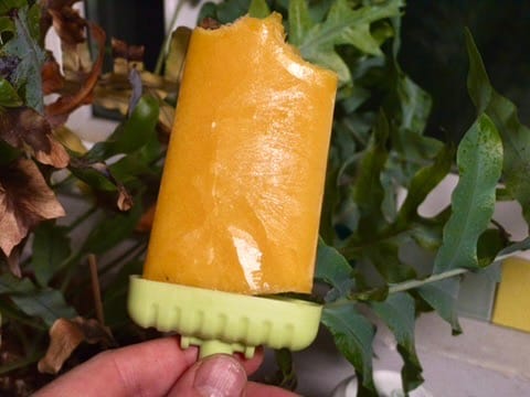 I had two mangos that looked like they needed eating, so I peeled ‘em, threw ‘em in the blender, funneled the purée into my popsicle molds, and threw ‘em in the freezer. The result: delicious flavor, great texture, healthy treat, more please!