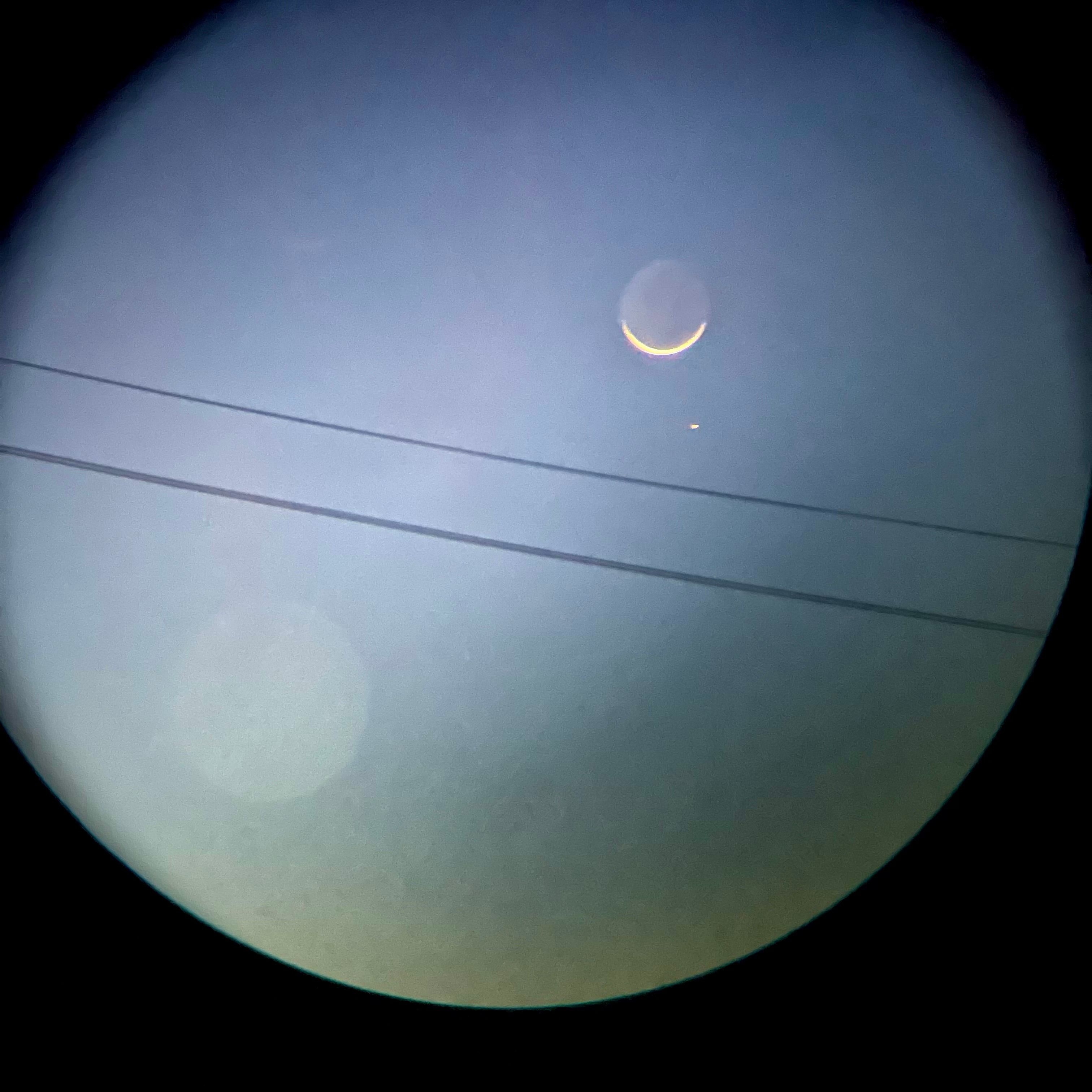 Last Thursday, as sunset tailed into night, the kid and I sat on the couch by the window and looked out at a thin crescent moon, low in the sky. Just under it hung the planet Mercury. (I took out my phone to look this up.) We got out the binoculars and looked more closely. How nice it is when the world hits you over the head with its wonders.