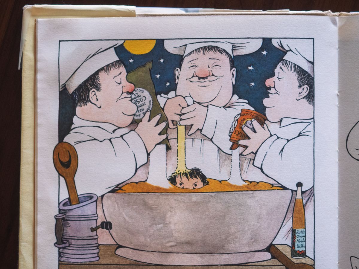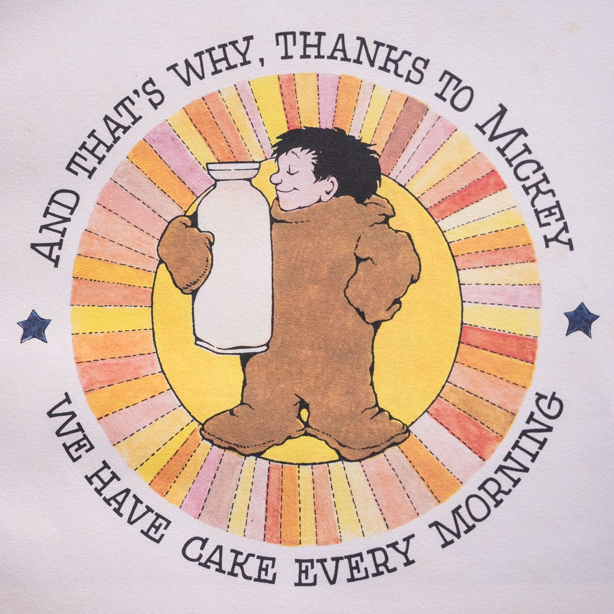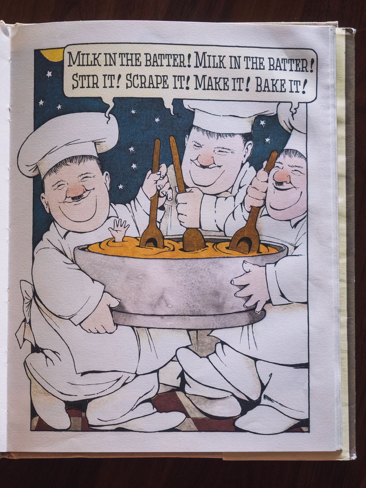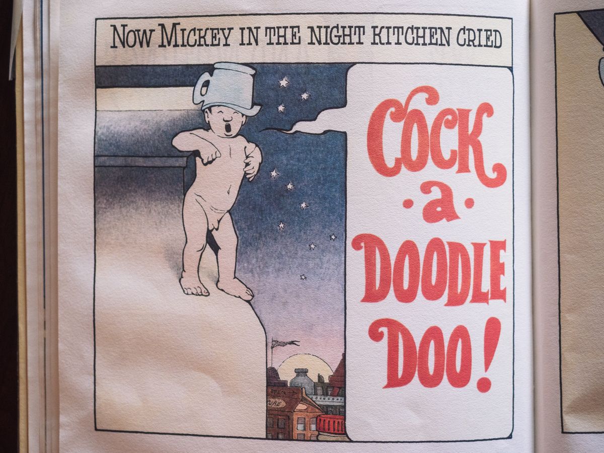 In the Night Kitchen tells the story of a boy named Mickey, who after hearing a racket in the night (“THUMP,” “DUMP CLUMP LUMP,” “BUMP”) yells “QUIET DOWN THERE!” and promptly falls out of his clothes and into the phantasmagoria that is the “night kitchen.” The story advances with the logic of a dream. Three identical bakers mistake him for milk, mix him into their batter, and put him in the “Mickey Oven” to bake “a delicious Mickey-cake.” Mickey escapes the oven and jumps into some bread dough, which he kneads and punches and pounds and pulls into the shape of a single-propeller airplane, which he proceeds to pilot to the top of a giant milk bottle. He dives into the milk and, returning to the surface, pours some down into the batter for the three identical bakers, so they can bake their cake. He then cries “Cock-a-Doodle Doo!” and slides back into bed. The book ends with an insane statement: “And that’s why, thanks to Mickey, we have cake every morning.”