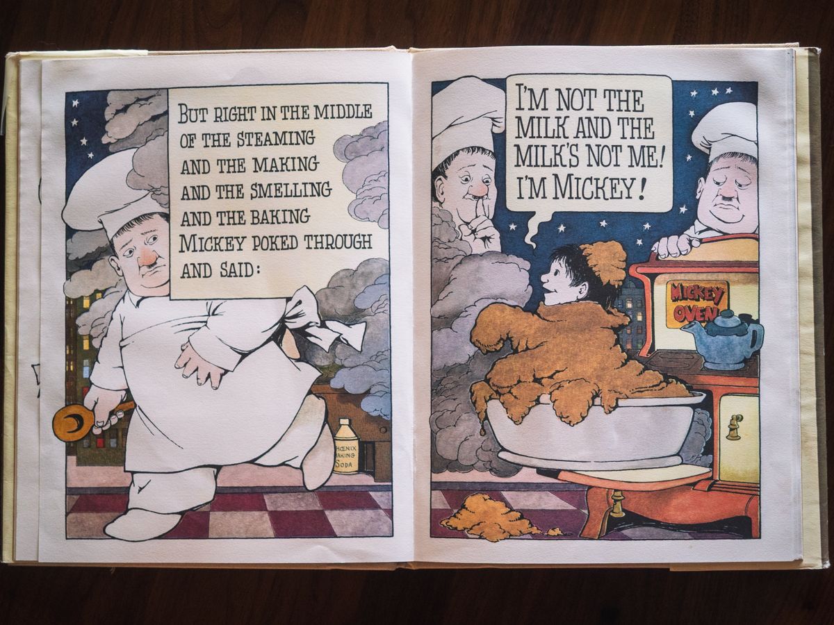 On the page that faces this image, Mickey is entirely submerged, except for his plaintive hand, sticking out from the doughy mass. My kid always points at the hand and says, “Oh no!”