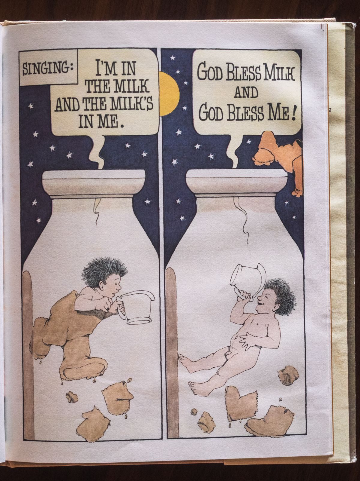 One of the great joys of childrearing is to play or walk or read alongside your kid and thereby to confront the world as you would if you yourself were a one-, two-, three-, or seven-year-old again. The playing requires full immersion, no checking of the phone. The walking can be slow, but you see a thousand details you would walk right by in your adult routine. And if the book is good, you get to sink into its pleasures again and again and again. Once the novelty wears off, you’re left with the artwork itself: the steaming and the making and the smelling and the baking. You are, once again, in the night kitchen. And you’re singing: “I’m in the milk and the milk’s in me. God Bless Milk and God Bless Me!”