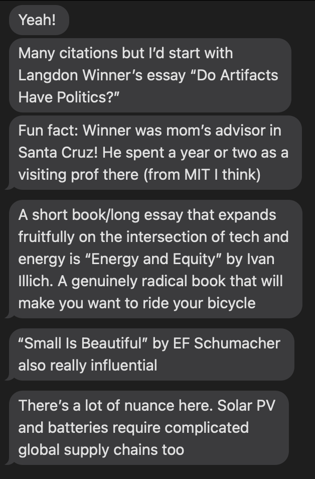 I first heard this idea from my brother Elias, who is currently finishing up a master’s degree in energy technology and policy. The other day, as I chewed on these ideas again, I hit him up for a reading list on the subject. He texted me back: